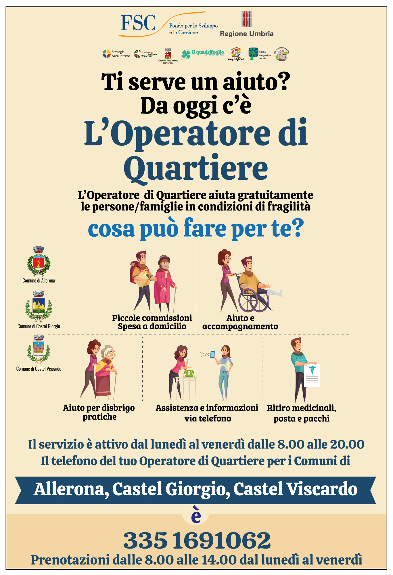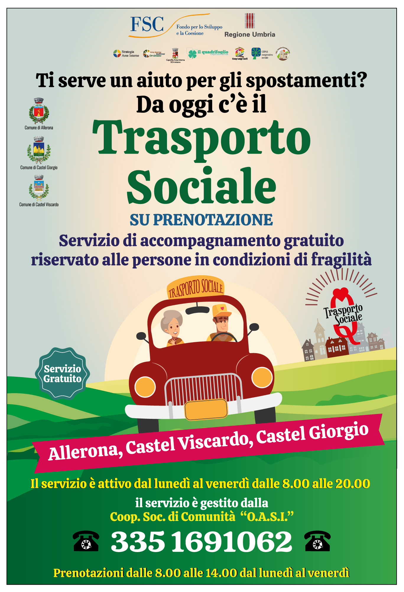A partire dal 6 ottobre prendono avvio i Servizi denominati “Operatore di Quartiere” e “Trasporto Sociale”, azioni a valere su risorse Fsc 2014-2020 di cui al piano di sviluppo e coesione della regione Umbria – sezione speciale, linea di azione “miglioramento dell’accesso a servizi accessibili, sostenibili e di qualità, compresi i servizi sociali e cure sanitarie d’interesse generale”.